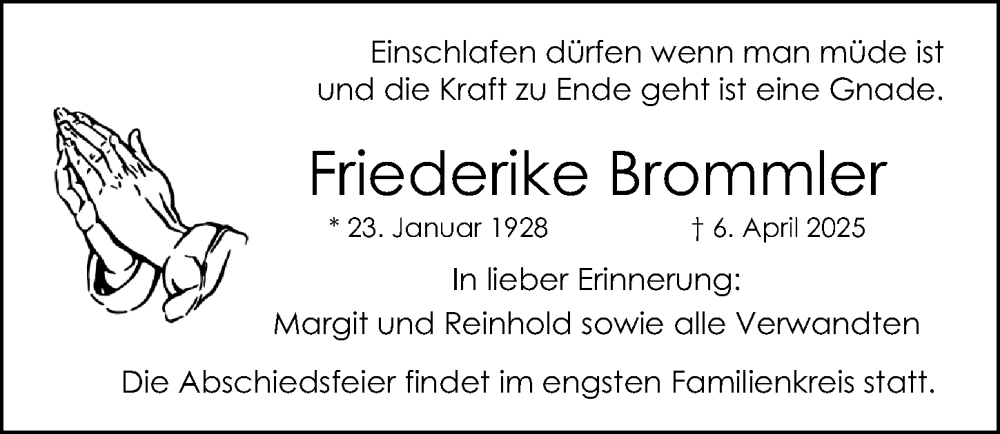Hier finden Sie alle Traueranzeigen aus der Zeitung, die bisher für Friederike Brommler erschienen sind. Weitere Traueranzeigen, die in der Zeitung erscheinen, werden hier ebenfalls aufgelistet
