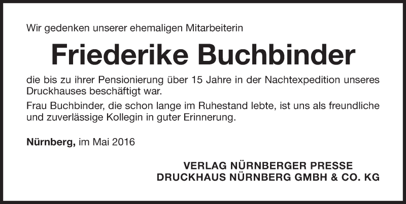 Hier finden Sie alle Traueranzeigen aus der Zeitung, die bisher für Friederike Buchbinder erschienen sind. Weitere Traueranzeigen, die in der Zeitung erscheinen, werden hier ebenfalls aufgelistet
