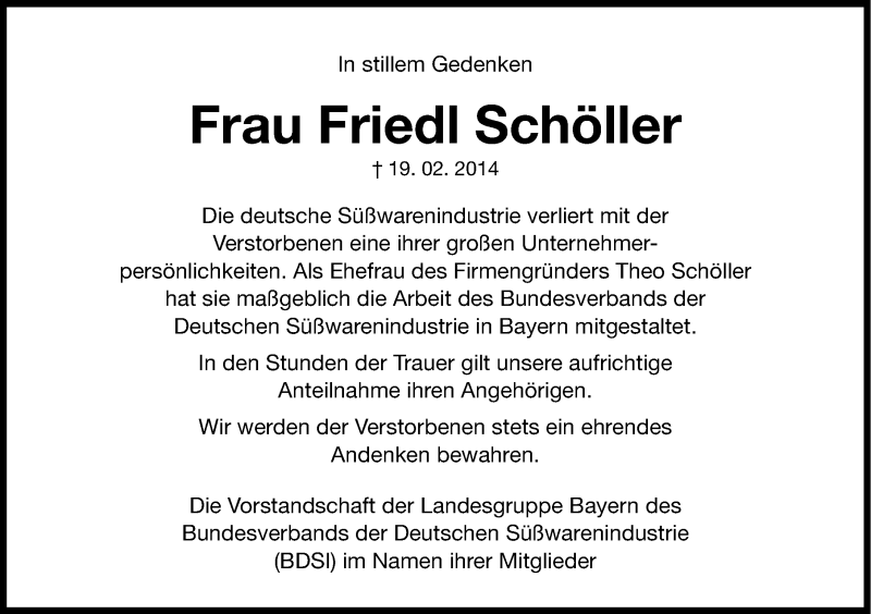 Hier finden Sie alle Traueranzeigen aus der Zeitung, die bisher für Friedl Schöller erschienen sind. Weitere Traueranzeigen, die in der Zeitung erscheinen, werden hier ebenfalls aufgelistet