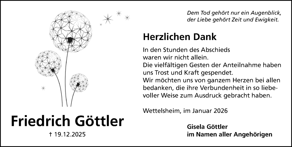 Hier finden Sie alle Traueranzeigen aus der Zeitung, die bisher für Friedrich Göttler erschienen sind. Weitere Traueranzeigen, die in der Zeitung erscheinen, werden hier ebenfalls aufgelistet