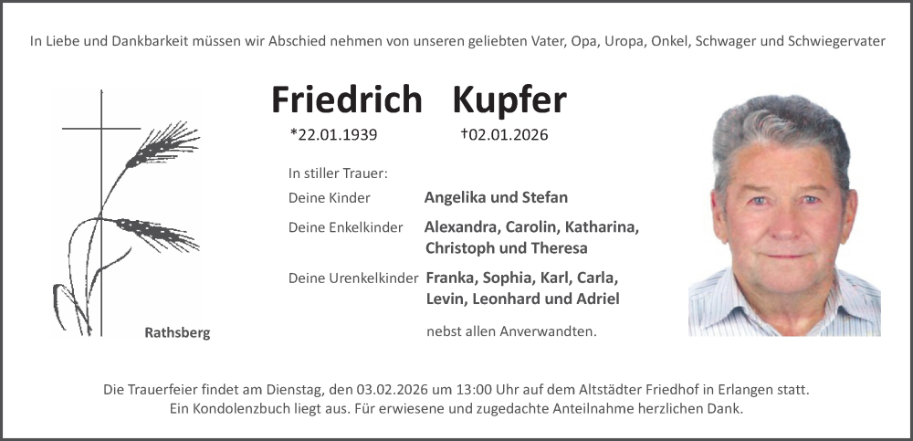 Hier finden Sie alle Traueranzeigen aus der Zeitung, die bisher für Friedrich Kupfer erschienen sind. Weitere Traueranzeigen, die in der Zeitung erscheinen, werden hier ebenfalls aufgelistet