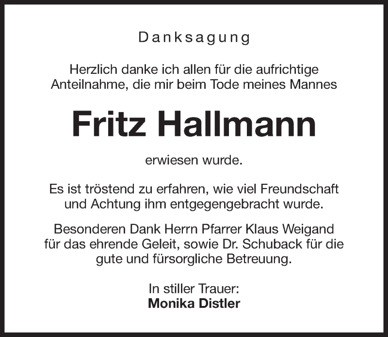Hier finden Sie alle Traueranzeigen aus der Zeitung, die bisher für Fritz Hallmann erschienen sind. Weitere Traueranzeigen, die in der Zeitung erscheinen, werden hier ebenfalls aufgelistet