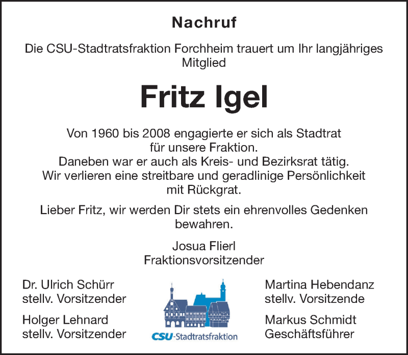 Hier finden Sie alle Traueranzeigen aus der Zeitung, die bisher für Fritz Igel erschienen sind. Weitere Traueranzeigen, die in der Zeitung erscheinen, werden hier ebenfalls aufgelistet