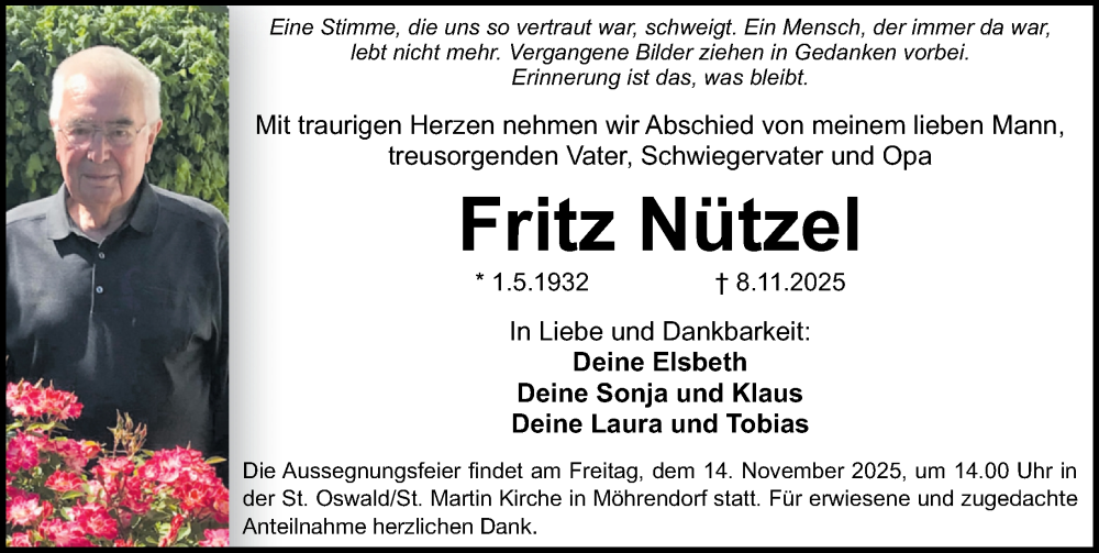 Hier finden Sie alle Traueranzeigen aus der Zeitung, die bisher für Fritz Nützel erschienen sind. Weitere Traueranzeigen, die in der Zeitung erscheinen, werden hier ebenfalls aufgelistet