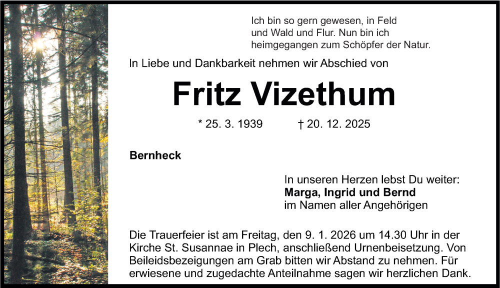 Hier finden Sie alle Traueranzeigen aus der Zeitung, die bisher für Fritz Vizethum erschienen sind. Weitere Traueranzeigen, die in der Zeitung erscheinen, werden hier ebenfalls aufgelistet