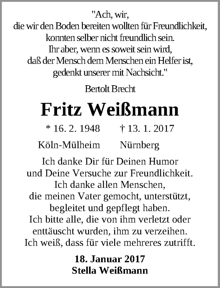 Hier finden Sie alle Traueranzeigen aus der Zeitung, die bisher für Fritz Weißmann erschienen sind. Weitere Traueranzeigen, die in der Zeitung erscheinen, werden hier ebenfalls aufgelistet