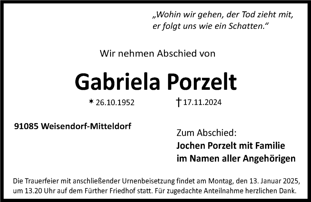 Hier finden Sie alle Traueranzeigen aus der Zeitung, die bisher für Gabriela Porzelt erschienen sind. Weitere Traueranzeigen, die in der Zeitung erscheinen, werden hier ebenfalls aufgelistet
