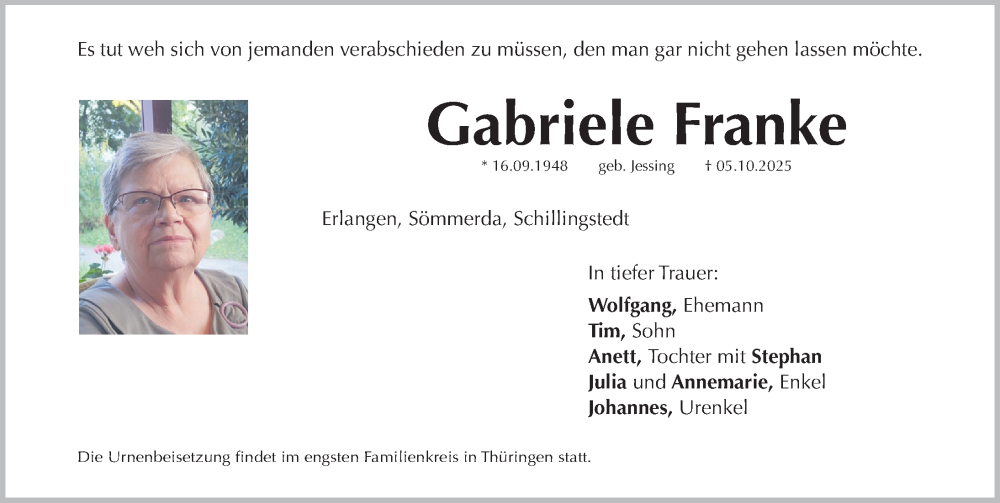Hier finden Sie alle Traueranzeigen aus der Zeitung, die bisher für Gabriele Franke erschienen sind. Weitere Traueranzeigen, die in der Zeitung erscheinen, werden hier ebenfalls aufgelistet
