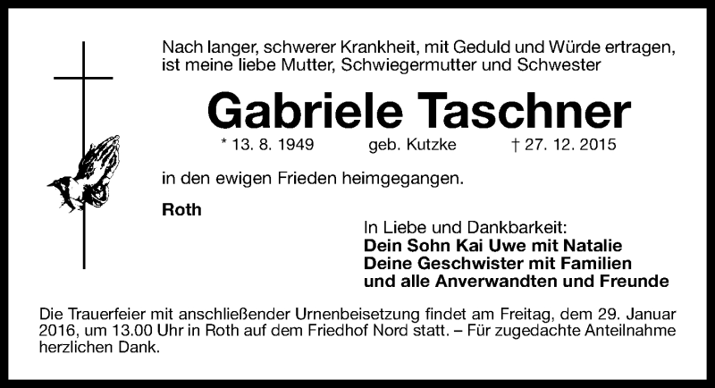 Hier finden Sie alle Traueranzeigen aus der Zeitung, die bisher für Gabriele Taschner erschienen sind. Weitere Traueranzeigen, die in der Zeitung erscheinen, werden hier ebenfalls aufgelistet