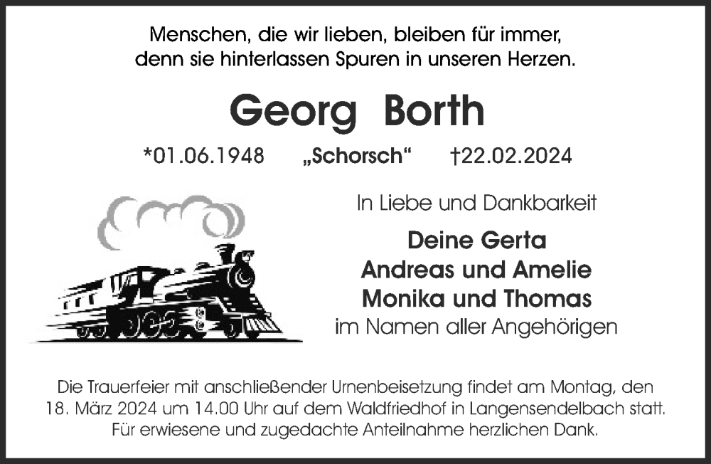 Hier finden Sie alle Traueranzeigen aus der Zeitung, die bisher für Georg Borth erschienen sind. Weitere Traueranzeigen, die in der Zeitung erscheinen, werden hier ebenfalls aufgelistet