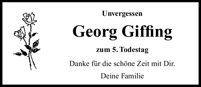 Hier finden Sie alle Traueranzeigen aus der Zeitung, die bisher für Georg Giffing erschienen sind. Weitere Traueranzeigen, die in der Zeitung erscheinen, werden hier ebenfalls aufgelistet