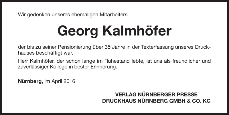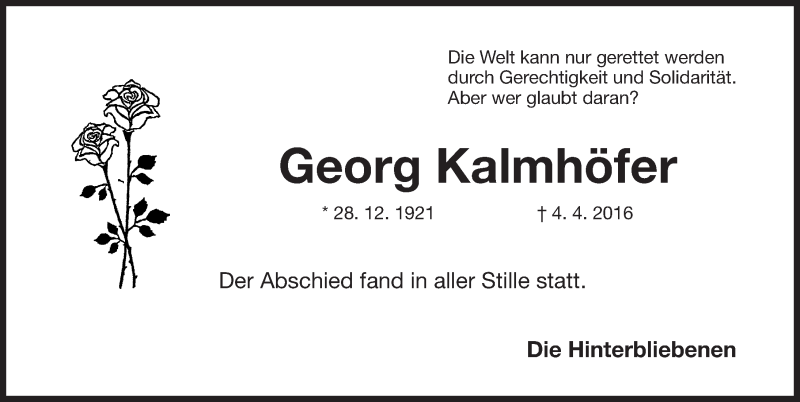 Hier finden Sie alle Traueranzeigen aus der Zeitung, die bisher für Georg Kalmhöfer erschienen sind. Weitere Traueranzeigen, die in der Zeitung erscheinen, werden hier ebenfalls aufgelistet