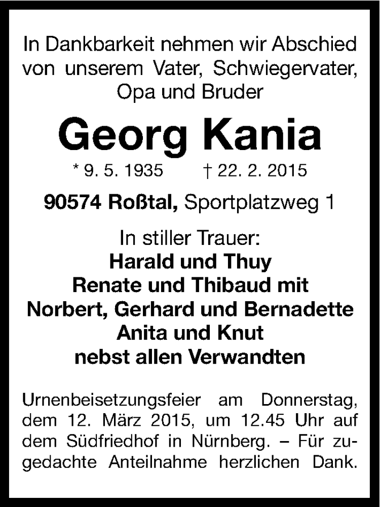 Hier finden Sie alle Traueranzeigen aus der Zeitung, die bisher für Georg Kania erschienen sind. Weitere Traueranzeigen, die in der Zeitung erscheinen, werden hier ebenfalls aufgelistet