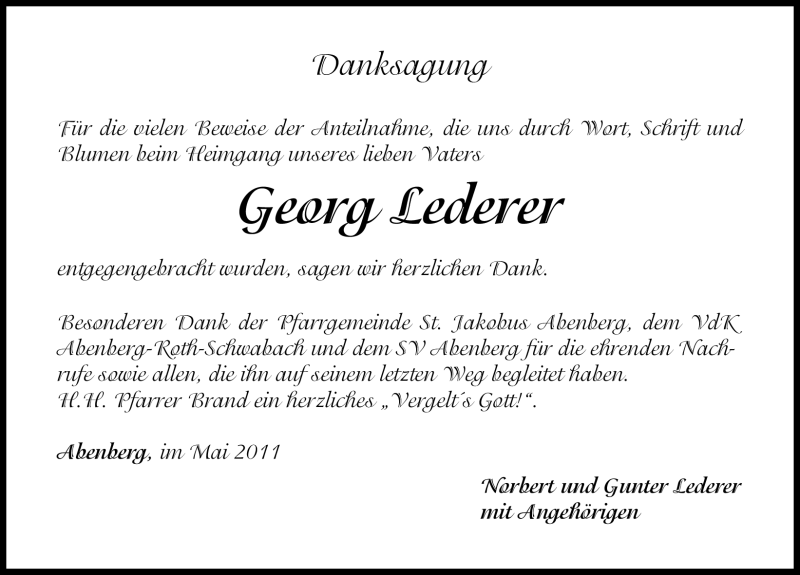 Hier finden Sie alle Traueranzeigen aus der Zeitung, die bisher für Georg Lederer erschienen sind. Weitere Traueranzeigen, die in der Zeitung erscheinen, werden hier ebenfalls aufgelistet