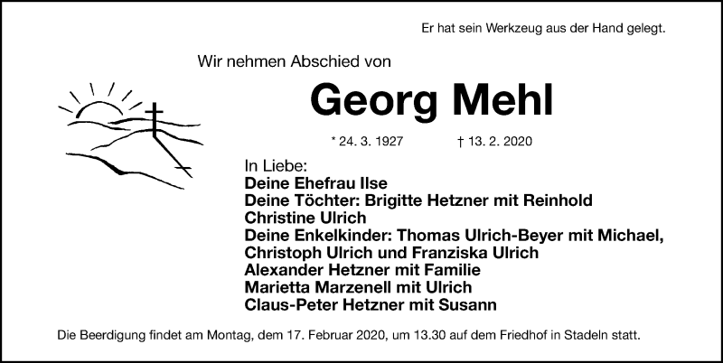 Hier finden Sie alle Traueranzeigen aus der Zeitung, die bisher für Georg Mehl erschienen sind. Weitere Traueranzeigen, die in der Zeitung erscheinen, werden hier ebenfalls aufgelistet