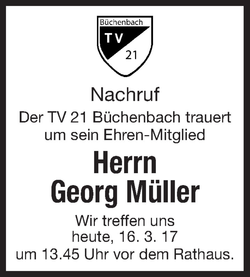 Hier finden Sie alle Traueranzeigen aus der Zeitung, die bisher für Georg Müller erschienen sind. Weitere Traueranzeigen, die in der Zeitung erscheinen, werden hier ebenfalls aufgelistet