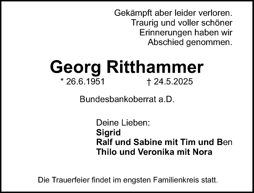 Hier finden Sie alle Traueranzeigen aus der Zeitung, die bisher für Georg Ritthammer erschienen sind. Weitere Traueranzeigen, die in der Zeitung erscheinen, werden hier ebenfalls aufgelistet