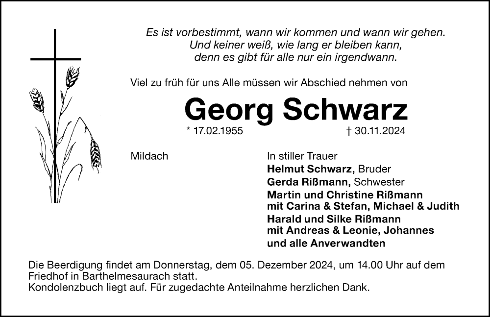 Hier finden Sie alle Traueranzeigen aus der Zeitung, die bisher für Georg Schwarz erschienen sind. Weitere Traueranzeigen, die in der Zeitung erscheinen, werden hier ebenfalls aufgelistet