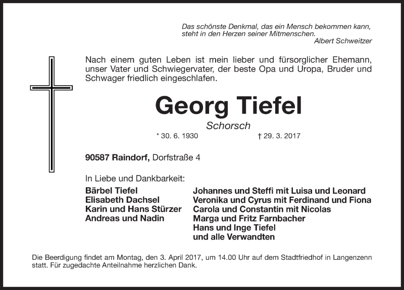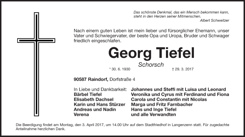 Hier finden Sie alle Traueranzeigen aus der Zeitung, die bisher für Georg Tiefel erschienen sind. Weitere Traueranzeigen, die in der Zeitung erscheinen, werden hier ebenfalls aufgelistet
