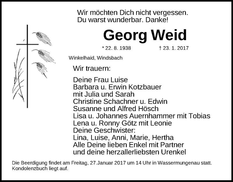 Hier finden Sie alle Traueranzeigen aus der Zeitung, die bisher für Georg Weid erschienen sind. Weitere Traueranzeigen, die in der Zeitung erscheinen, werden hier ebenfalls aufgelistet