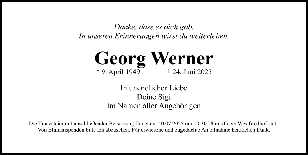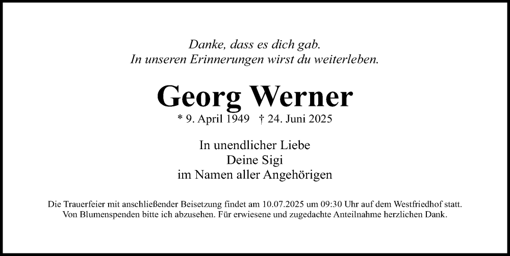 Hier finden Sie alle Traueranzeigen aus der Zeitung, die bisher für Georg Werner erschienen sind. Weitere Traueranzeigen, die in der Zeitung erscheinen, werden hier ebenfalls aufgelistet