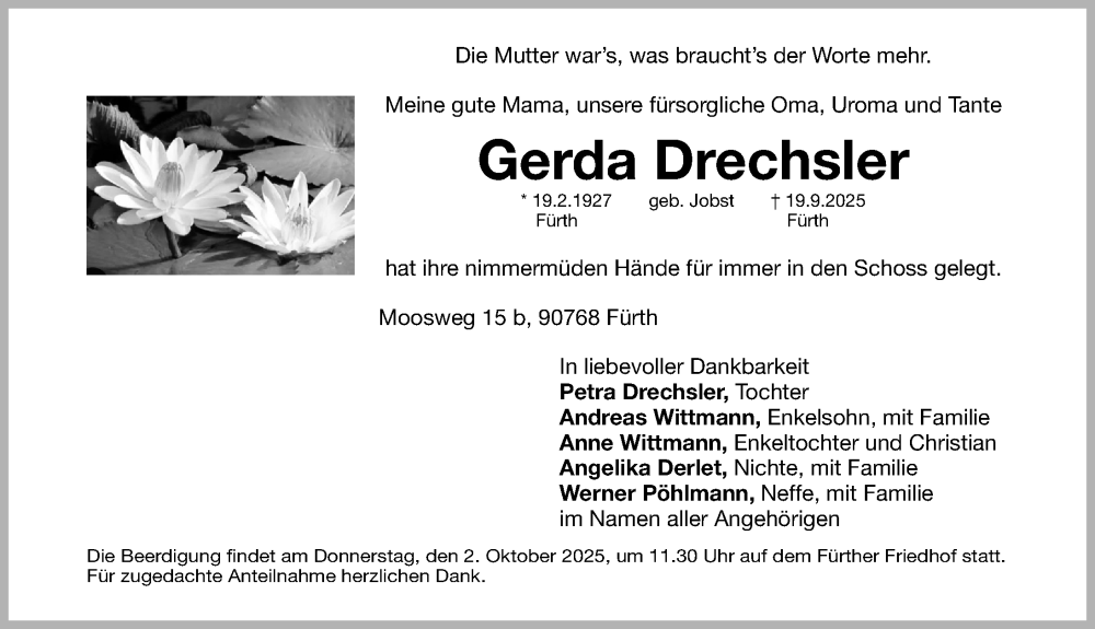 Hier finden Sie alle Traueranzeigen aus der Zeitung, die bisher für Gerda Drechsler erschienen sind. Weitere Traueranzeigen, die in der Zeitung erscheinen, werden hier ebenfalls aufgelistet