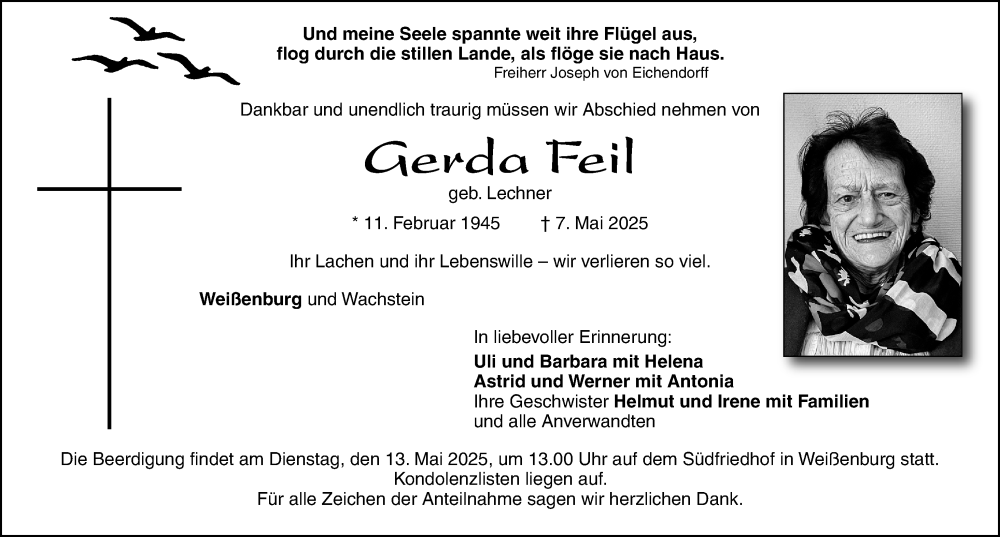 Hier finden Sie alle Traueranzeigen aus der Zeitung, die bisher für Gerda Feil erschienen sind. Weitere Traueranzeigen, die in der Zeitung erscheinen, werden hier ebenfalls aufgelistet