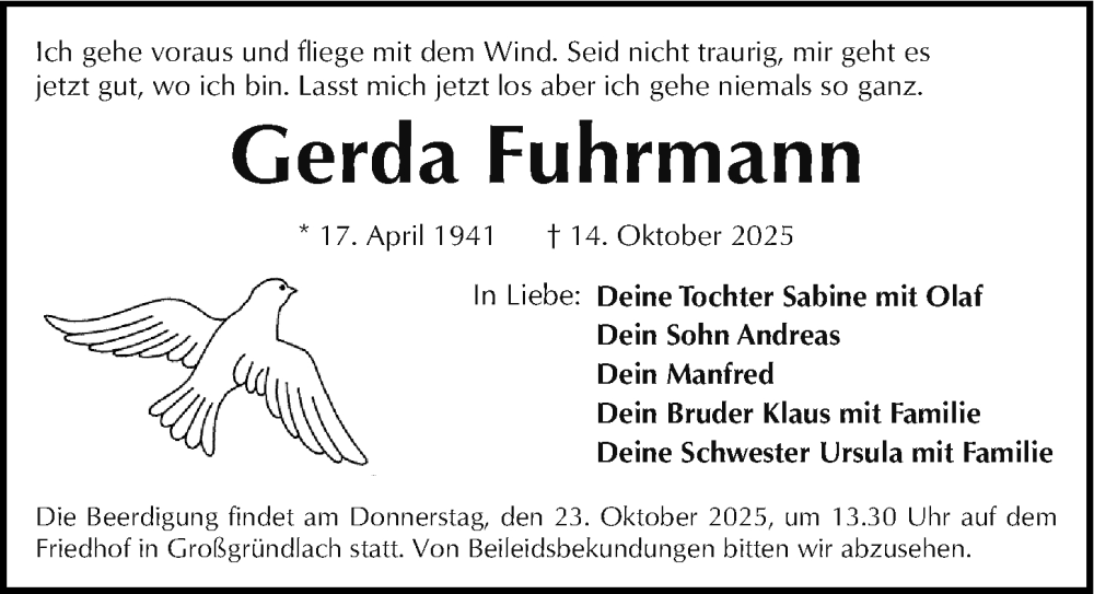 Hier finden Sie alle Traueranzeigen aus der Zeitung, die bisher für Gerda Fuhrmann erschienen sind. Weitere Traueranzeigen, die in der Zeitung erscheinen, werden hier ebenfalls aufgelistet