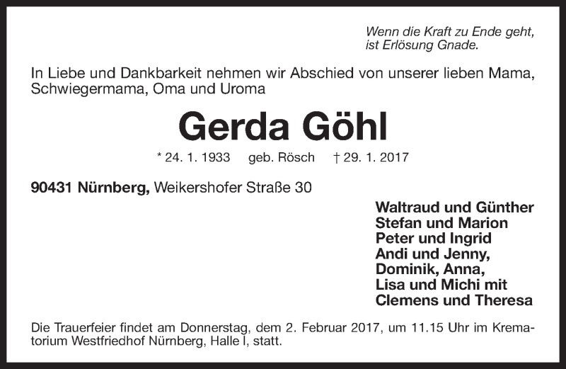 Hier finden Sie alle Traueranzeigen aus der Zeitung, die bisher für Gerda Göhl erschienen sind. Weitere Traueranzeigen, die in der Zeitung erscheinen, werden hier ebenfalls aufgelistet