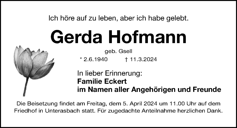 Hier finden Sie alle Traueranzeigen aus der Zeitung, die bisher für Gerda Hofmann erschienen sind. Weitere Traueranzeigen, die in der Zeitung erscheinen, werden hier ebenfalls aufgelistet