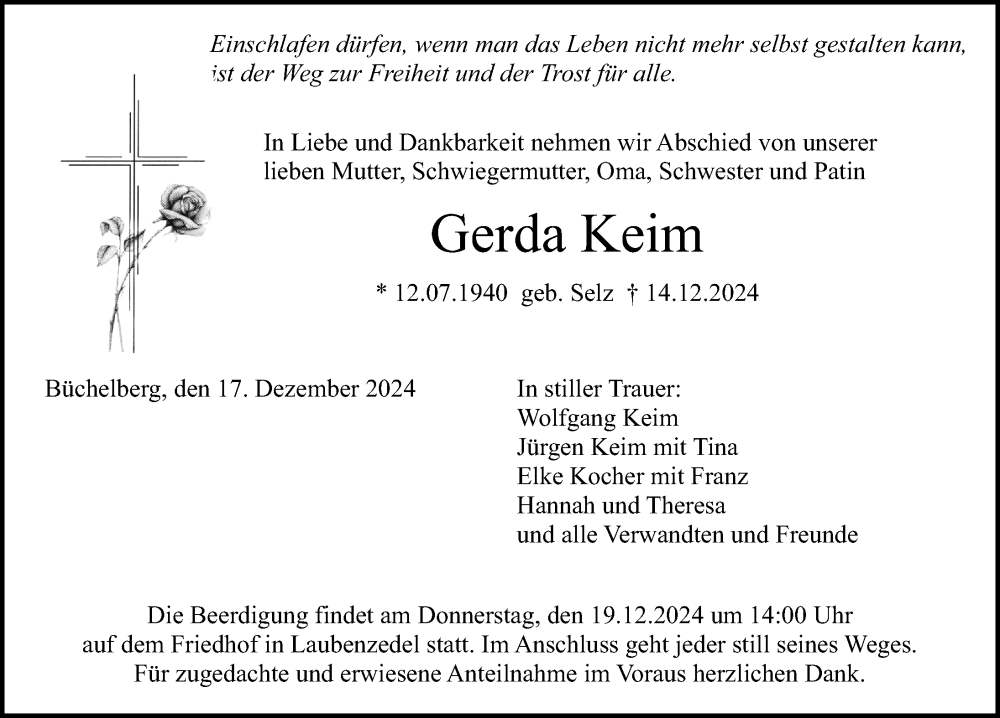 Hier finden Sie alle Traueranzeigen aus der Zeitung, die bisher für Gerda Keim erschienen sind. Weitere Traueranzeigen, die in der Zeitung erscheinen, werden hier ebenfalls aufgelistet