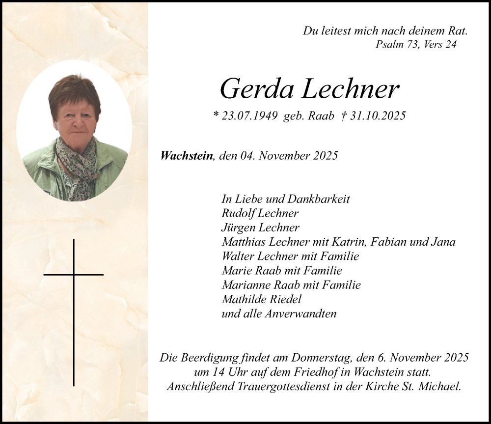 Hier finden Sie alle Traueranzeigen aus der Zeitung, die bisher für Gerda Lechner erschienen sind. Weitere Traueranzeigen, die in der Zeitung erscheinen, werden hier ebenfalls aufgelistet