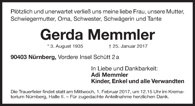 Hier finden Sie alle Traueranzeigen aus der Zeitung, die bisher für Gerda Memmler erschienen sind. Weitere Traueranzeigen, die in der Zeitung erscheinen, werden hier ebenfalls aufgelistet