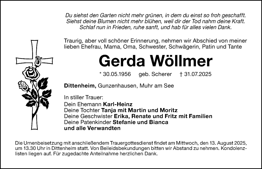 Hier finden Sie alle Traueranzeigen aus der Zeitung, die bisher für Gerda Wöllmer erschienen sind. Weitere Traueranzeigen, die in der Zeitung erscheinen, werden hier ebenfalls aufgelistet