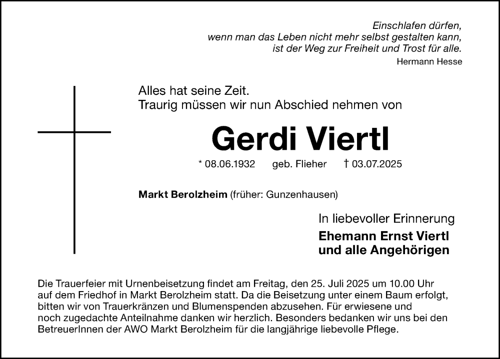 Hier finden Sie alle Traueranzeigen aus der Zeitung, die bisher für Gerdi Viertl erschienen sind. Weitere Traueranzeigen, die in der Zeitung erscheinen, werden hier ebenfalls aufgelistet