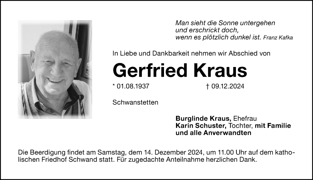 Hier finden Sie alle Traueranzeigen aus der Zeitung, die bisher für Gerfried Kraus erschienen sind. Weitere Traueranzeigen, die in der Zeitung erscheinen, werden hier ebenfalls aufgelistet