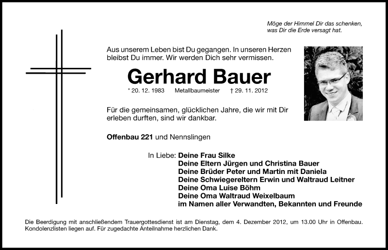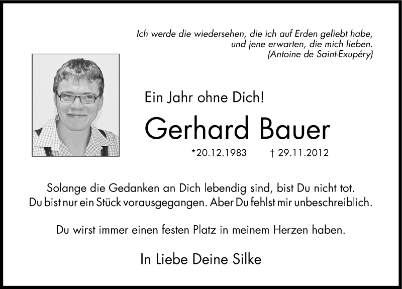 Hier finden Sie alle Traueranzeigen aus der Zeitung, die bisher für Gerhard Bauer erschienen sind. Weitere Traueranzeigen, die in der Zeitung erscheinen, werden hier ebenfalls aufgelistet