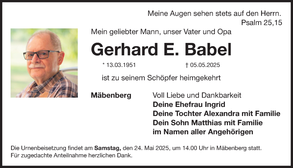 Hier finden Sie alle Traueranzeigen aus der Zeitung, die bisher für Gerhard E. Babel erschienen sind. Weitere Traueranzeigen, die in der Zeitung erscheinen, werden hier ebenfalls aufgelistet