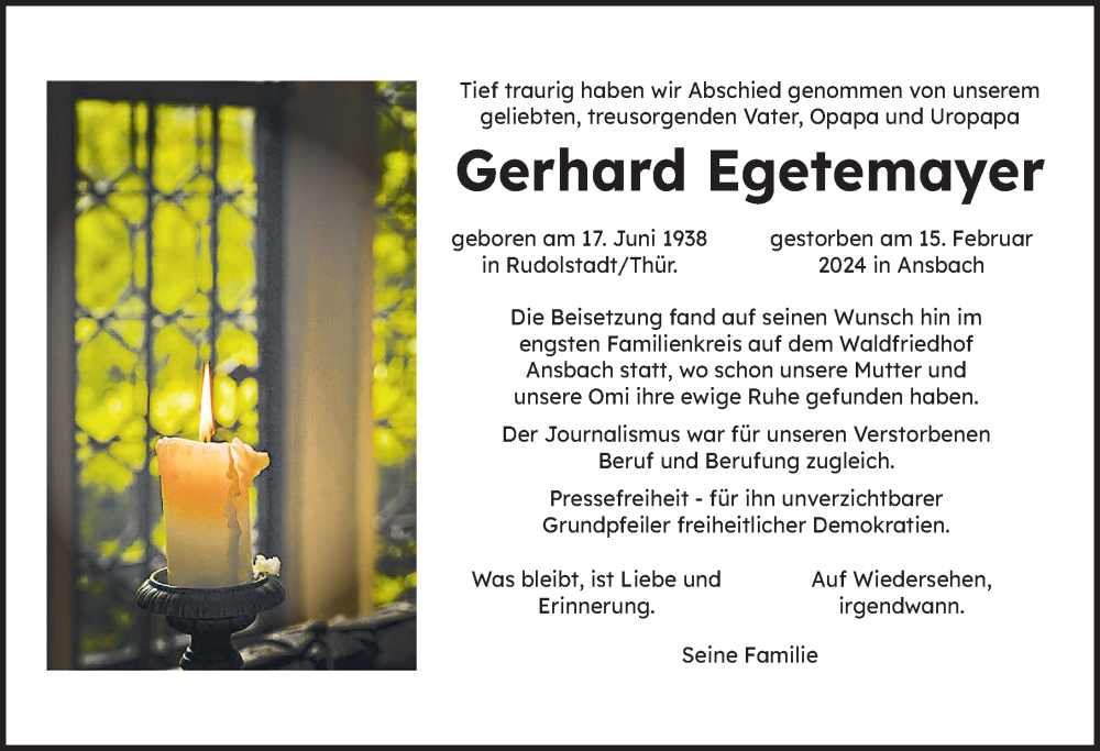 Hier finden Sie alle Traueranzeigen aus der Zeitung, die bisher für Gerhard Egetemayer erschienen sind. Weitere Traueranzeigen, die in der Zeitung erscheinen, werden hier ebenfalls aufgelistet