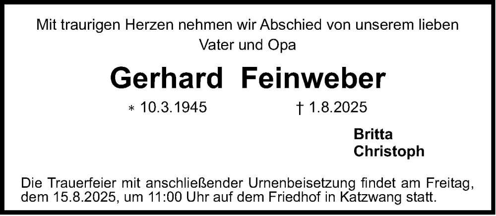 Hier finden Sie alle Traueranzeigen aus der Zeitung, die bisher für Gerhard Feinweber erschienen sind. Weitere Traueranzeigen, die in der Zeitung erscheinen, werden hier ebenfalls aufgelistet