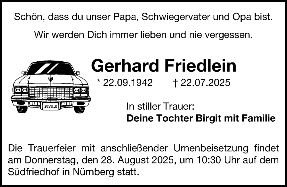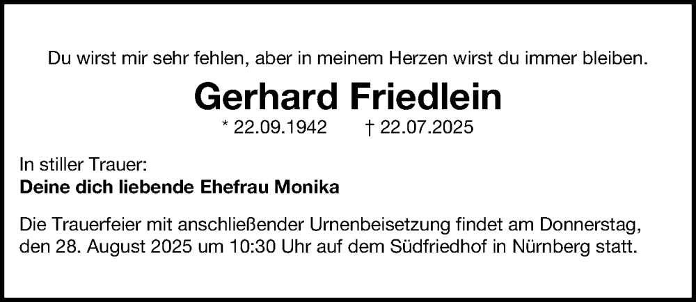 Hier finden Sie alle Traueranzeigen aus der Zeitung, die bisher für Gerhard Friedlein erschienen sind. Weitere Traueranzeigen, die in der Zeitung erscheinen, werden hier ebenfalls aufgelistet
