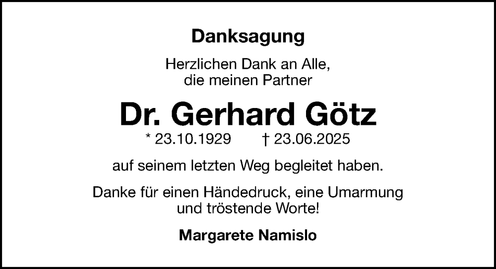 Hier finden Sie alle Traueranzeigen aus der Zeitung, die bisher für Gerhard Götz erschienen sind. Weitere Traueranzeigen, die in der Zeitung erscheinen, werden hier ebenfalls aufgelistet