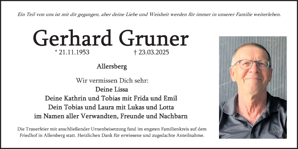 Hier finden Sie alle Traueranzeigen aus der Zeitung, die bisher für Gerhard Gruner erschienen sind. Weitere Traueranzeigen, die in der Zeitung erscheinen, werden hier ebenfalls aufgelistet