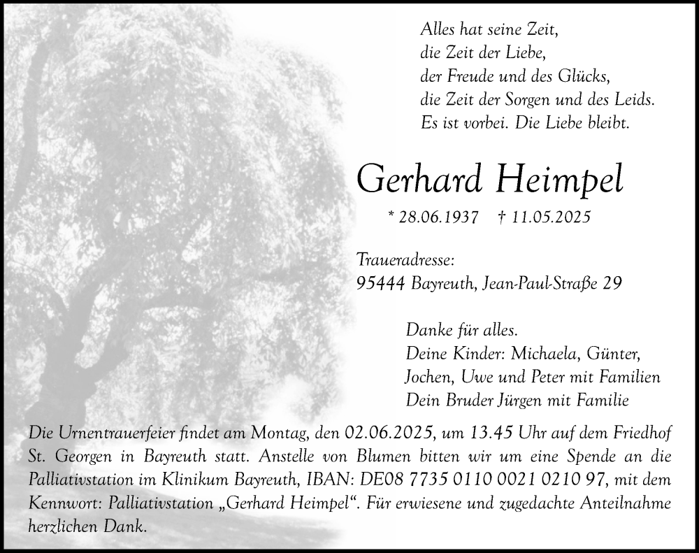 Hier finden Sie alle Traueranzeigen aus der Zeitung, die bisher für Gerhard Heimpel erschienen sind. Weitere Traueranzeigen, die in der Zeitung erscheinen, werden hier ebenfalls aufgelistet