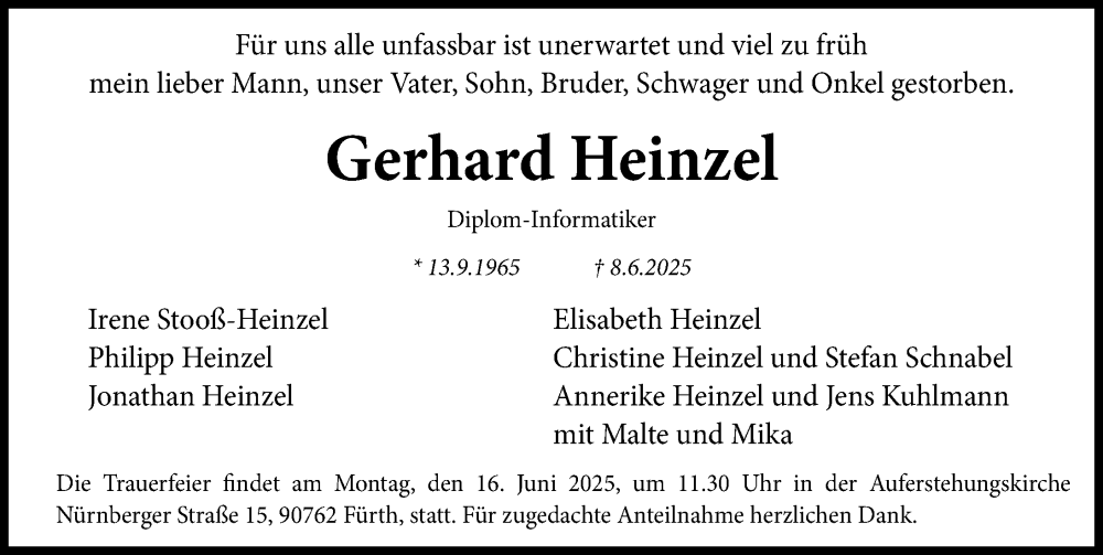 Hier finden Sie alle Traueranzeigen aus der Zeitung, die bisher für Gerhard Heinzel erschienen sind. Weitere Traueranzeigen, die in der Zeitung erscheinen, werden hier ebenfalls aufgelistet
