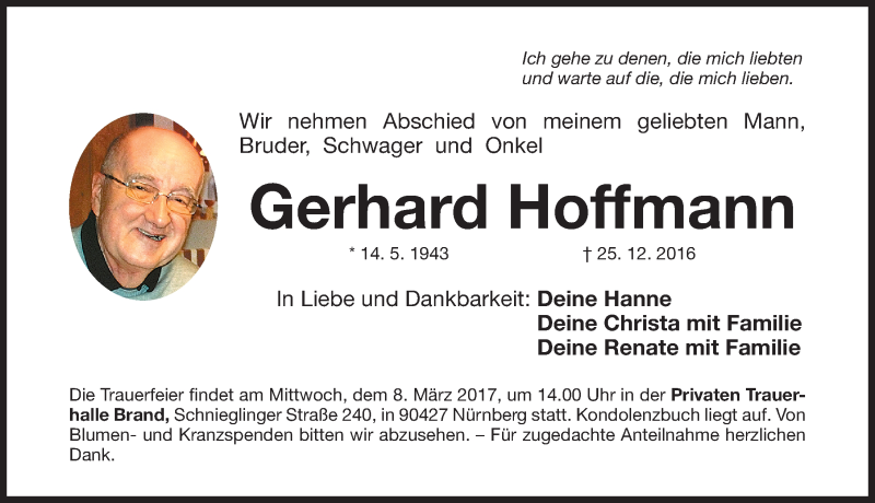 Hier finden Sie alle Traueranzeigen aus der Zeitung, die bisher für Gerhard Hoffmann erschienen sind. Weitere Traueranzeigen, die in der Zeitung erscheinen, werden hier ebenfalls aufgelistet