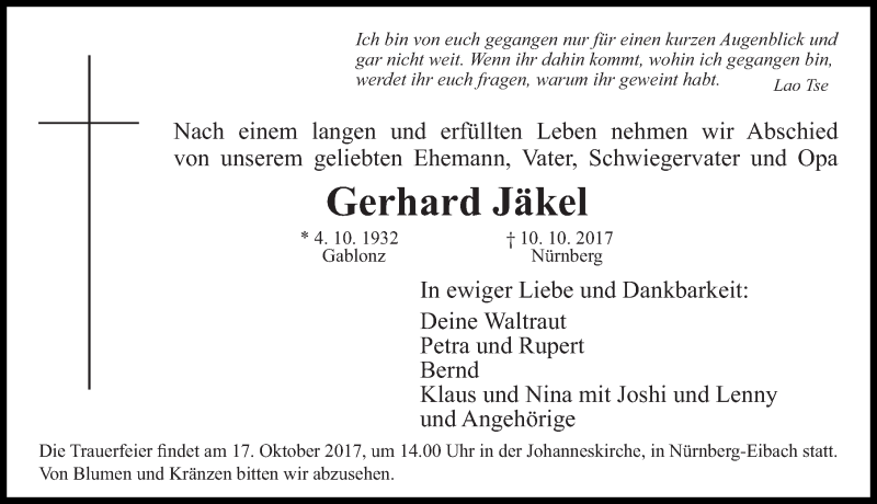 Hier finden Sie alle Traueranzeigen aus der Zeitung, die bisher für Gerhard Jäkel erschienen sind. Weitere Traueranzeigen, die in der Zeitung erscheinen, werden hier ebenfalls aufgelistet