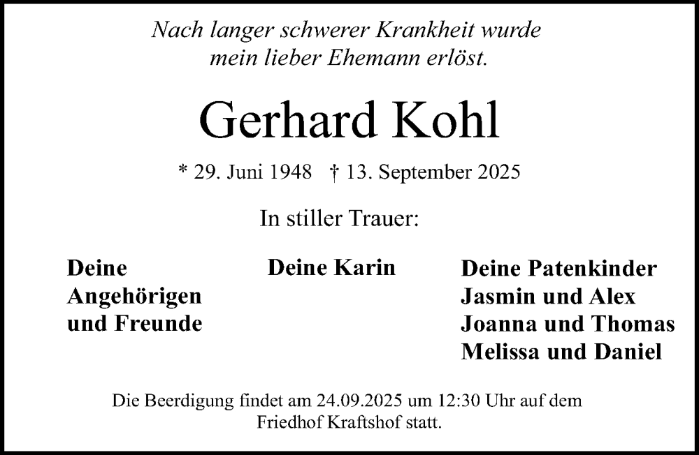 Hier finden Sie alle Traueranzeigen aus der Zeitung, die bisher für Gerhard Kohl erschienen sind. Weitere Traueranzeigen, die in der Zeitung erscheinen, werden hier ebenfalls aufgelistet