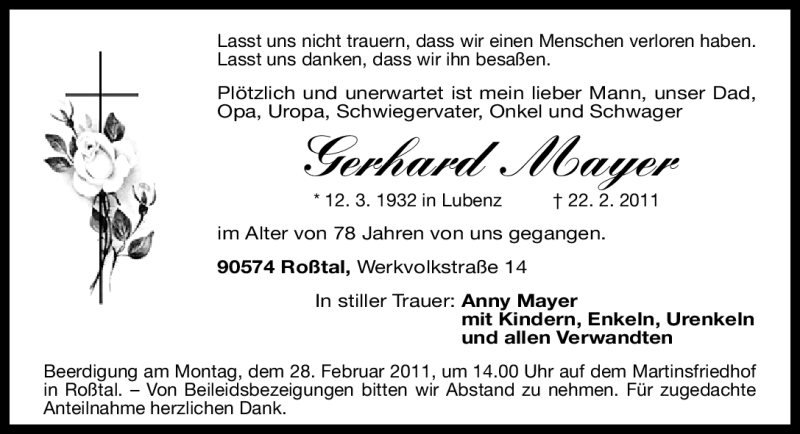 Hier finden Sie alle Traueranzeigen aus der Zeitung, die bisher für Gerhard Mayer erschienen sind. Weitere Traueranzeigen, die in der Zeitung erscheinen, werden hier ebenfalls aufgelistet