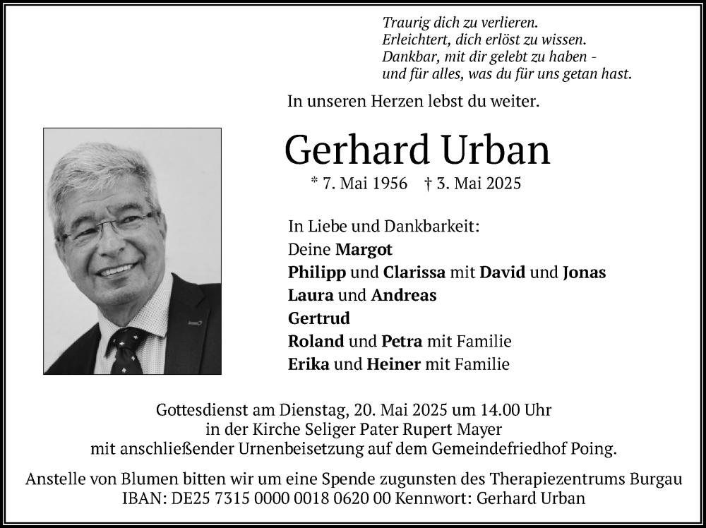 Hier finden Sie alle Traueranzeigen aus der Zeitung, die bisher für Gerhard Urban erschienen sind. Weitere Traueranzeigen, die in der Zeitung erscheinen, werden hier ebenfalls aufgelistet
